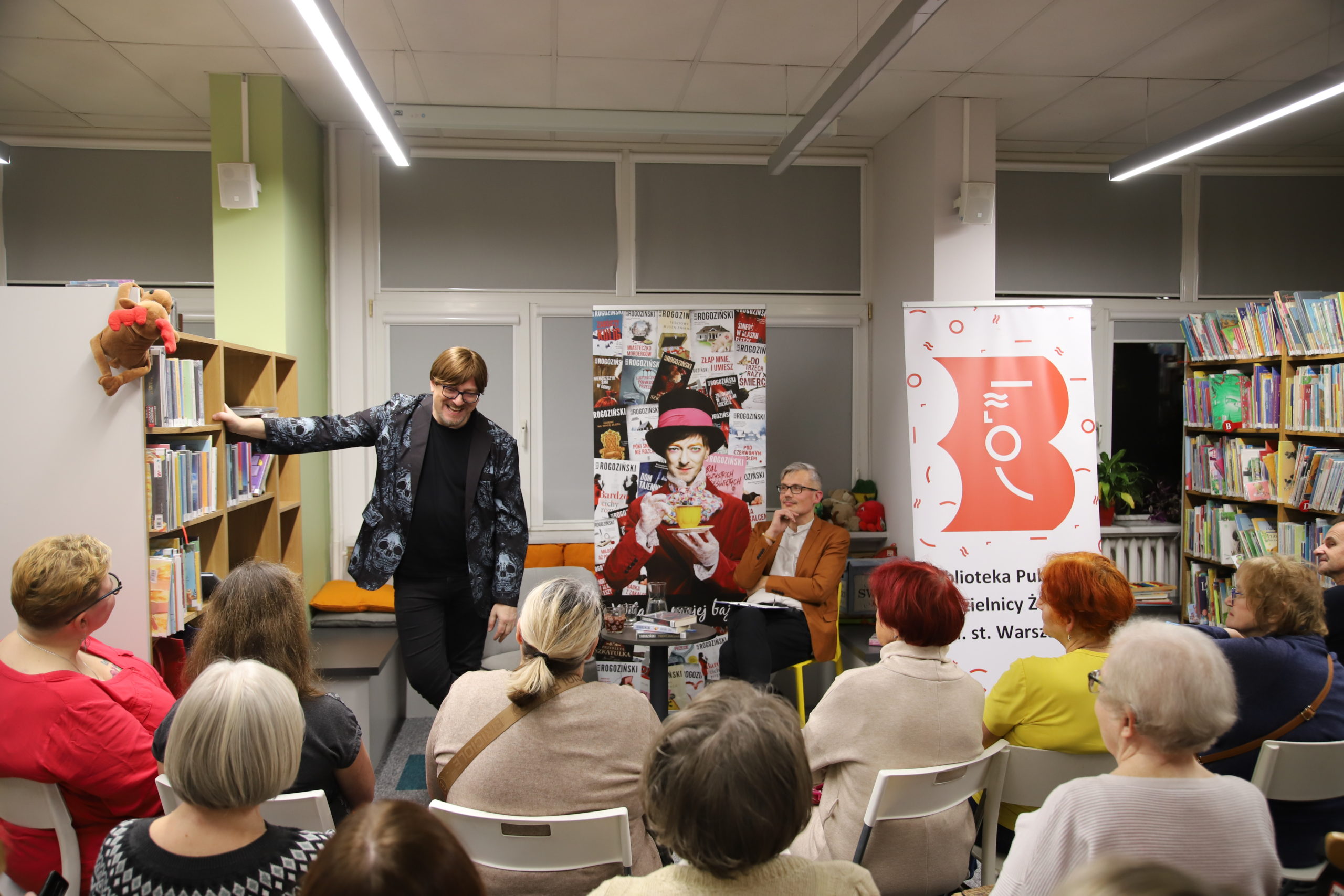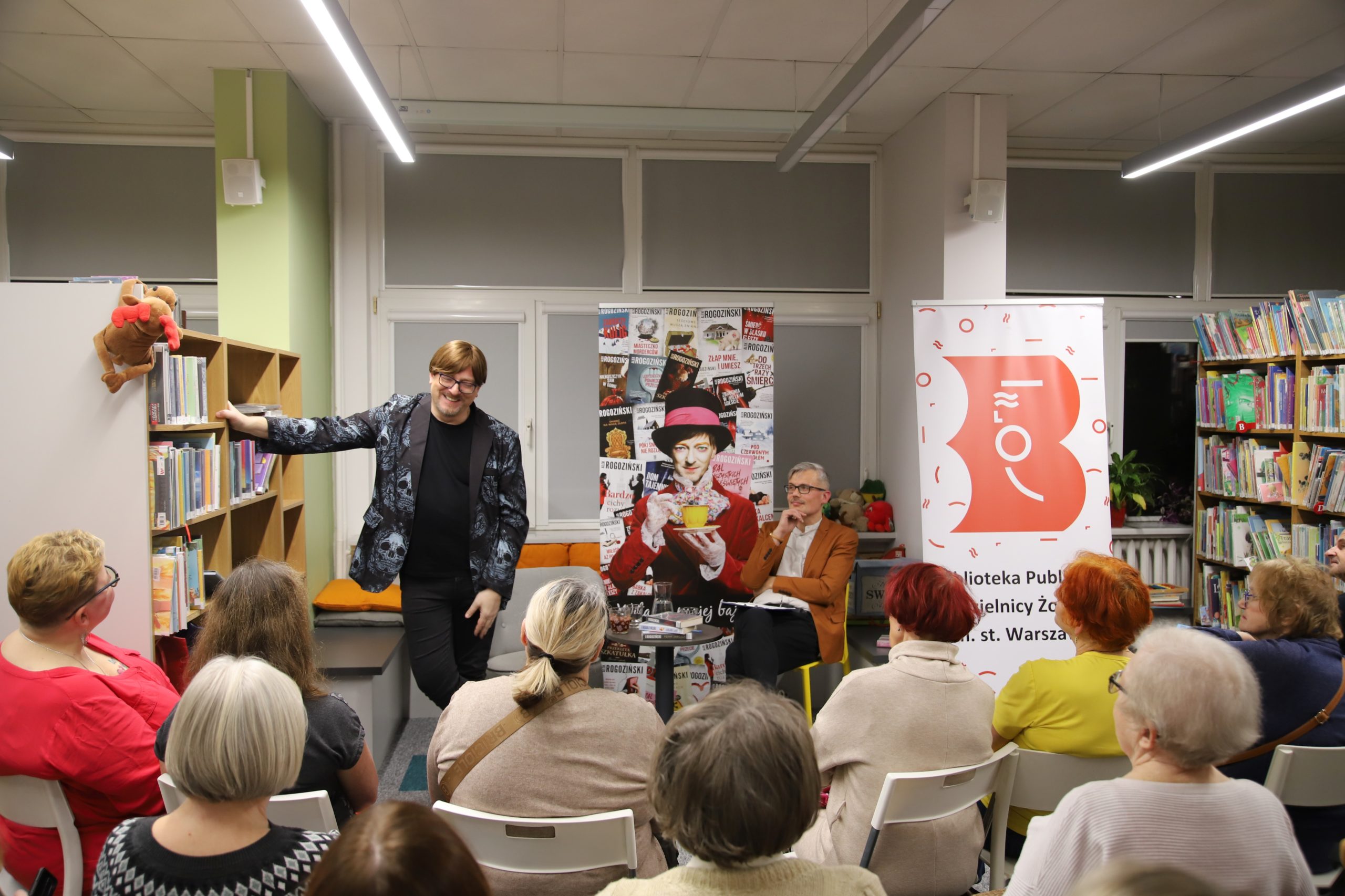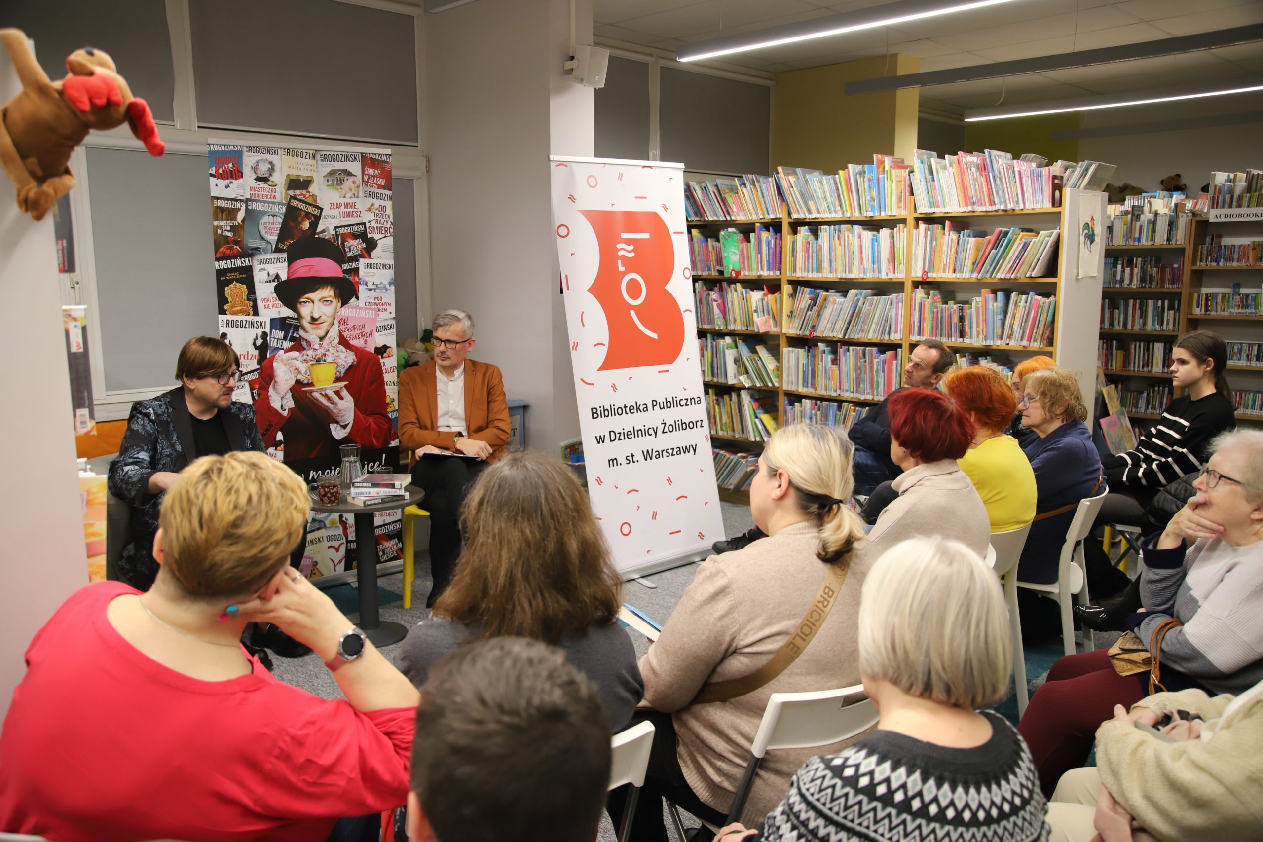 Spotkanie autorskie w bibliotece widziane od tyłu, z perspektywy publiczności. W pierwszym rzędzie siedzi grupa osób zwrócona w stronę prowadzących. Przed nimi, na tle planszy z ilustracją i baneru biblioteki, siedzą dwie osoby prowadzące rozmowę. Otoczenie to jasna czytelnia z regałami wypełnionymi książkami.