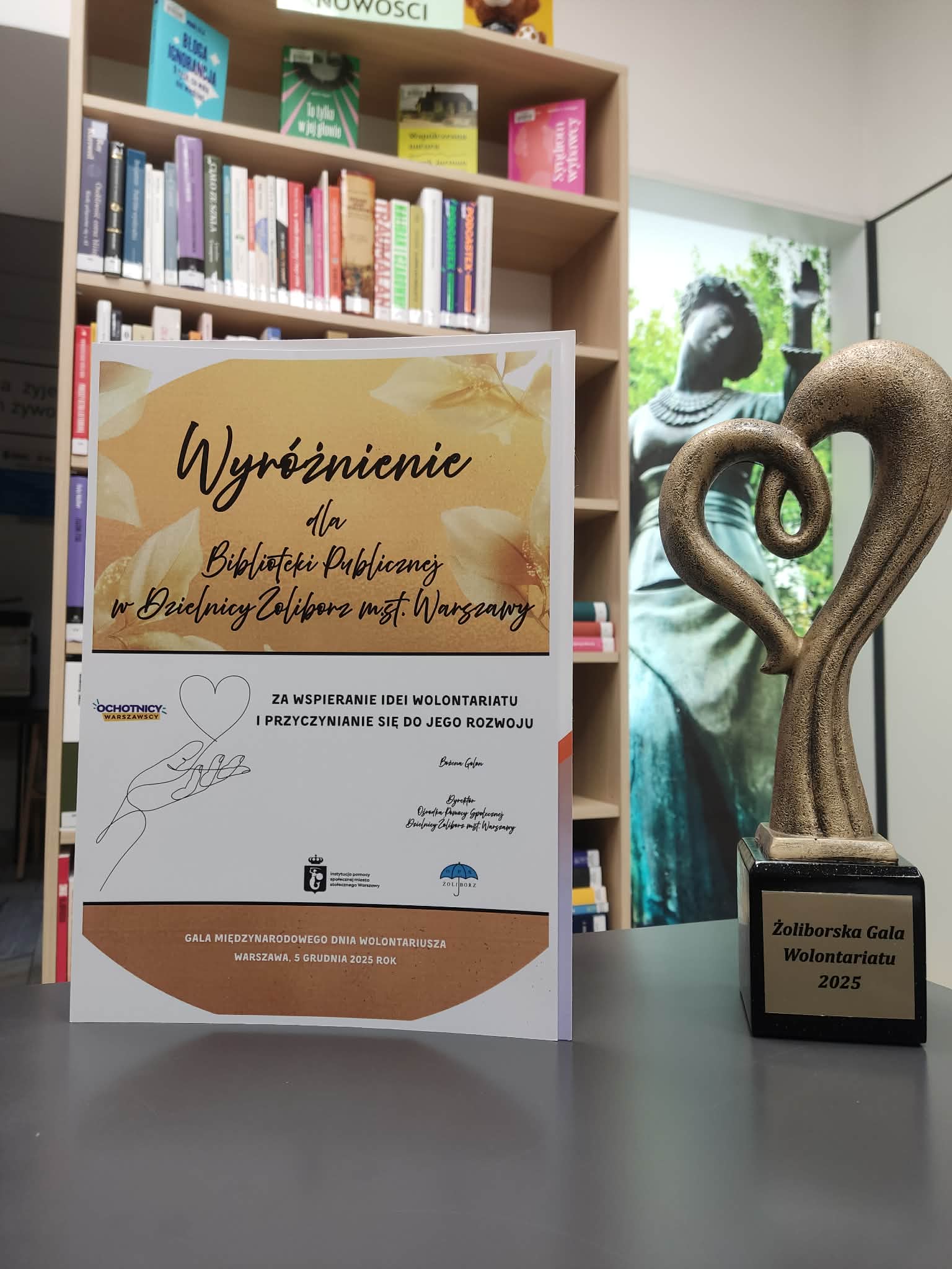 5 grudnia na Gali Międzynarodowego Dnia Wolontariusza, która miała miejsce w Urzędzie Dzielnicy Żoliborz, Biblioteka Żoliborska otrzymała wyróżnienie za wspieranie idei wolontariatu i przyczynianie się do jego rozwoju. Nagrodę wręczaną przez PaniąBurmistrz Dzielnicy Żoliborz – Panią Renatę Kozłowską oraz Dyrektor OPSu – Panią Bożenę Golon wraz z życzeniami dalszej współpracy odebrała Dyrektor Biblioteki Pani Małgorzata Kocot.