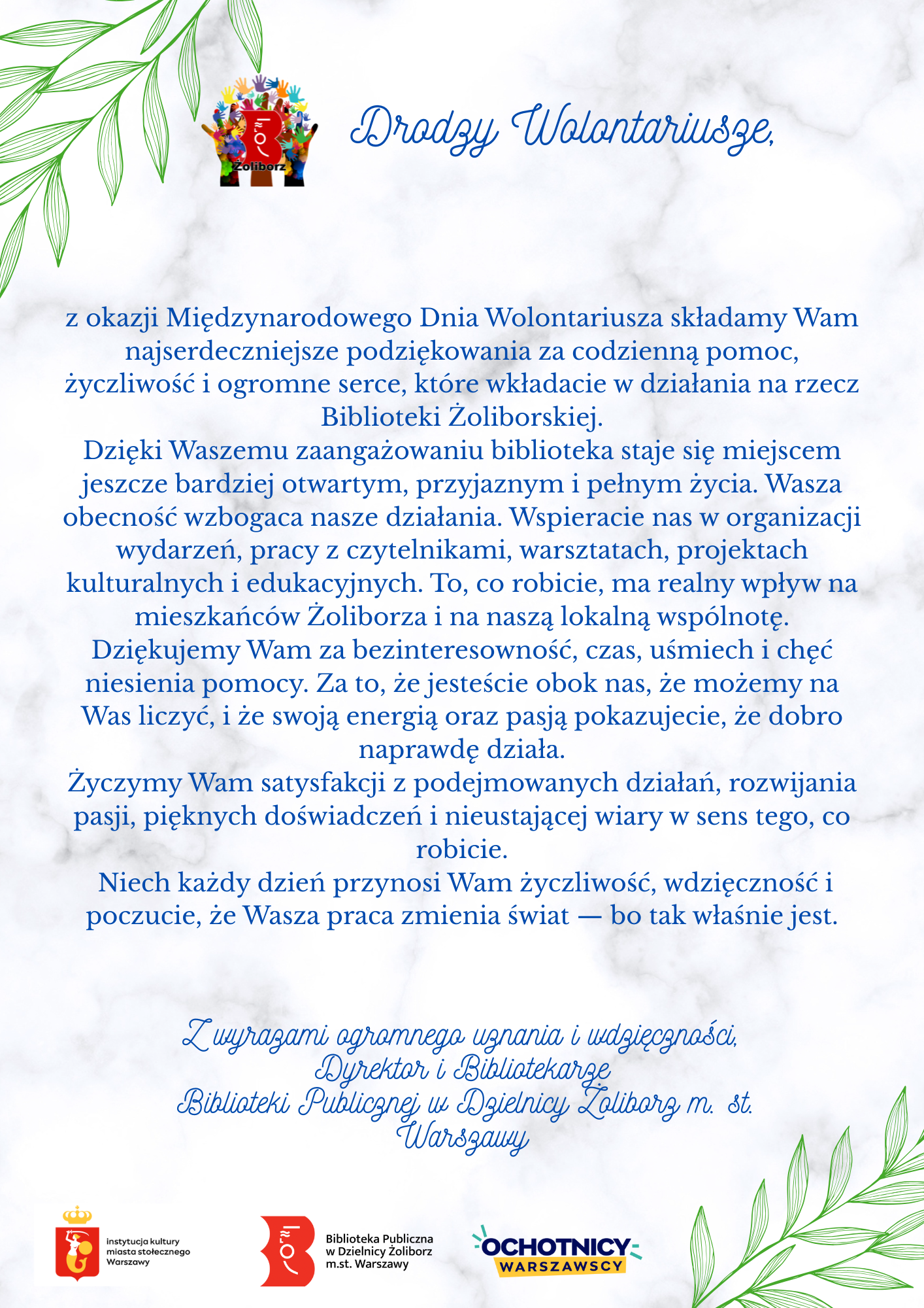 Z okazji Międzynarodowego Dnia Wolontariusza chcielibyśmy wyrazić naszą głęboką wdzięczność wszystkim wolontariuszom, którzy wspierają naszą Bibliotekę, podziękować za Wasze zaangażowanie, czas i wysiłek, które wkładacie w realizację naszych projektów i działań.