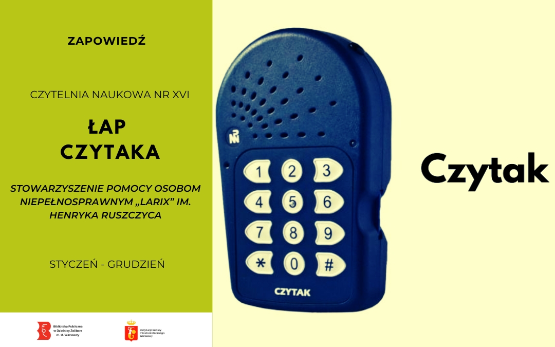 Czytelnia Naukowa nr XVI przedstawia specjalną ofertę dla niewidomych, niedowidzących i seniorów – CZYTAK. Czytak to podręczny odtwarzacz książek mówionych, wyposażony w duże, dobrze wyczuwalne przyciski i posiadający głośnik. Krótka, prosta instrukcja i intuicyjna obsługa sprawiają, że bardzo szybko można rozpocząć korzystanie ze sprzętu.