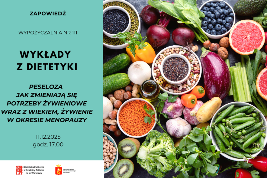 Zapraszamy do Wypożyczalni nr 111 na drugi wykład z dietetyki, który poprowadzi Pani Urszula L Kwiatek. Tematem spotkania będzie “PESELOZA jak zmieniają się potrzeby żywieniowe… Czytaj więcej »PESELOZA jak zmieniają się potrzeby żywieniowe wraz z wiekiem, żywienie w okresie menopauzy – wykład Urszula L Kwiatek